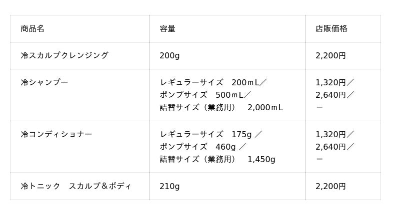 <左から:冷シャンプー、冷コンディショナー、冷スカルプクレンジング、冷トニック スカルプ&ボディ>