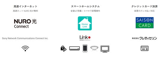 ※標準仕様となる主なサービス ・高速インターネット「NURO 光 Connect」(ソニーネットワークコミュニケーションズコネクト株式会社) ・スマートホームシステム(株式会社リンクジャパン) ・クレジットカード決済(株式会社クレディセゾン)
