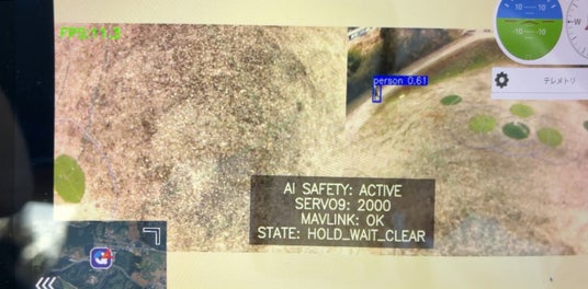 本ドローンは機上カメラを2基搭載しておりドローン直下及び前方を常時確認しながら飛行し、人や車、動物などを映像上で認識すると一時停止し、エリア外になるまで待機します。