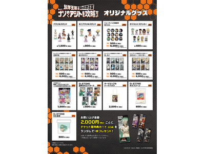 TVアニメ『Dr.STONE』のキャラクターイラストを使用したアクリルスタンドや缶バッジ、チェキ風カード、ステッカーなど、多彩なグッズを展開します。