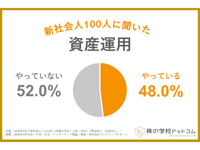 オンライン株式スクール「株の学校ドットコム」(運営会社:株式会社トレジャープロモート、東京都千代田区、代表取締役社長:瀬川 丈)は、この4月に新社会人となる学生100人を対象に、資産運用に関する実態調査を行いました。