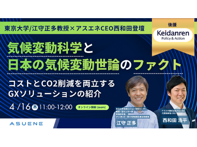 アスエネ株式会社(本社:東京都港区、代表取締役CEO:西和田 浩平、以下「当社」)は、4月16日(木)に、一般社団法人日本経済団体連合会の後援オンラインセミナー「【東京大学/江守 正多教授×アスエネ CEO 西和田氏登壇】気候変動科学と日本の気候変動世論のファクト、コストとCO2削減を両立するGXソリューションの紹介」を開催します。