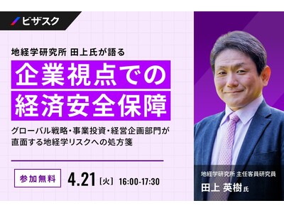 「知見と、挑戦をつなぐ」をミッションにグローバルなナレッジプラットフォームを運営する株式会社ビザスク(以下、当社)は、『企業視点での経済安全保障』をテーマに、地経学研究所 主任客員研究員 田上 英樹 氏 ご登壇による無料オンラインセミナーを 4/21 (火) 16:00 より開催します。
