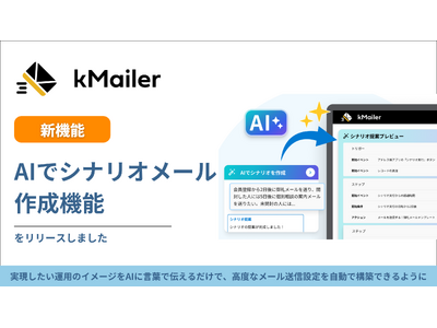 誰でも簡単に使えるビジネス向けのクラウドサービスを提供するトヨクモ株式会社(本社:東京都品川区、代表取締役社長:山本 裕次、以下トヨクモ)は、サイボウズ株式会社(本社:東京都中央区、社長:青野 慶久、以下サイボウズ)が提供する業務改善プラットフォームである「kintone」のデータを引用したメール送信からメールマーケティングまで行えるkintone連携メール配信システム「kMailer」において、新機能「AIでシナリオメール作成」を2026年4月6日より提供開始いたします。