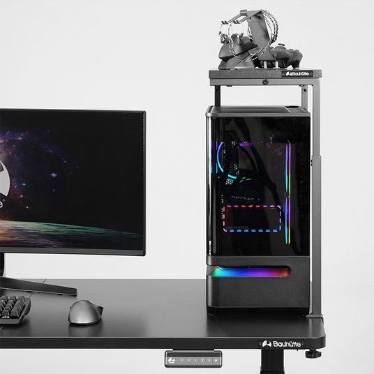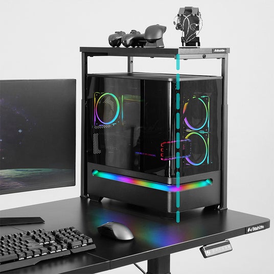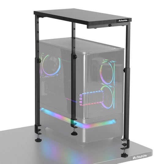 こだわりのライティングや内部パーツの輝きを遮りません。耐荷重15kgのタフな仕様で、大型PCに占拠されたデスク面積を垂直方向に拡張し、新たな天板スペースを増築可能です。手前の足がないため、幅や奥行のある筐体にも柔軟に対応します。