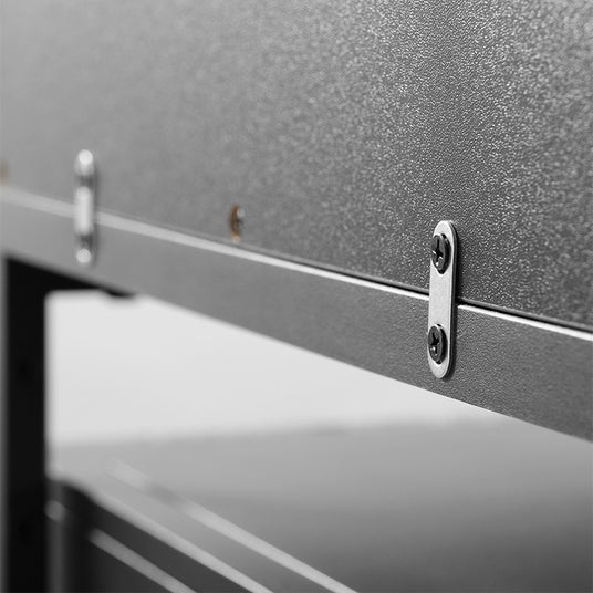 支柱は左右どちらでも組み換えできるため、あらゆる配置に柔軟に対応。ラックの長辺がデスク奥に来るように向きを90度変える、モニターの真上に天板スペースを増築するなど、汎用性の高い設計です。