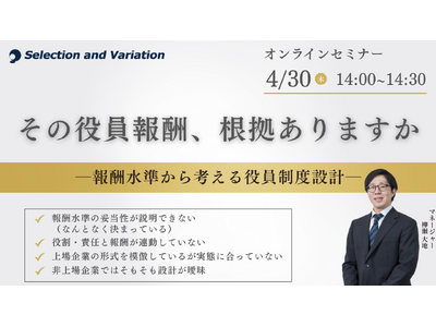 https://sele-vari.co.jp/ )は『その役員報酬、根拠ありますか ―報酬水準から考える役員制度設計―』セミナーを2026年4月30日(木)14:00~14:30に開催することをお知らせいたします。