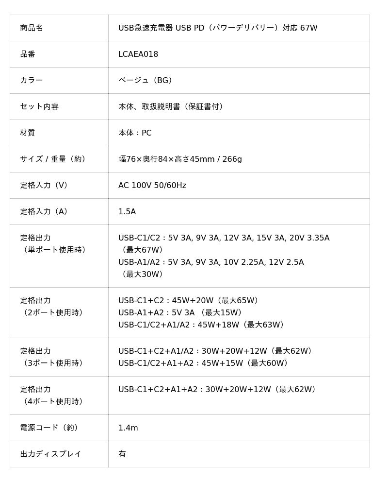 「USB急速充電器 USB PD(パワーデリバリー)対応 67W」LCAEA018