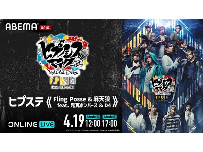 新しい未来のテレビ「ABEMA」は、『ヒプノシスマイク -Division Rap Battle-』Rule the Stage(通称ヒプステ)の新作公演「『ヒプノシスマイク -Division Rap Battle-』Rule the Stage《Fling Posse & 麻天狼 feat. 鬼瓦ボンバーズ & D4》」(以下、「ヒプステ《Fling Posse & 麻天狼 feat. 鬼瓦ボンバーズ & D4》」)の千秋楽2公演を、「ABEMA PPV(アベマ ペイパービュー)」にて、2026年4月19日(日)12時からと17時から独占生放送いたします。