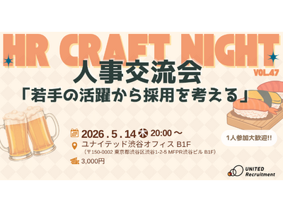 ユナイテッド株式会社(本社:東京都渋谷区、代表取締役社長 兼 執行役員:早川 与規、証券コード:2497)の連結子会社であるユナイテッド・リクルートメント株式会社(本社:東京都渋谷区、代表取締役:金子 陽三)は、これまで46回にわたりスタートアップから大手企業まで幅広い企業人事の皆さまに向けて、HR領域の知見共有・交流を目的に、「寿司とクラフトビールで仲間を作る」をテーマにした人事交流イベント「HR Craft Night」を開催してまいりました。