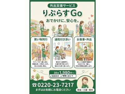 一般社団法人りぷらす(代表理事:橋本大吾、宮城県石巻市)は、2026年4月15日よりスタジオぷらす登米において「外出支援サービス」を開始します。買い物同行、医療機関への同行支援、趣味のお出かけ、送迎を通じて、介護保険では対応できない生活場面をサポート。社会との接点を再構築し、「自分らしい暮らし」を実現します。