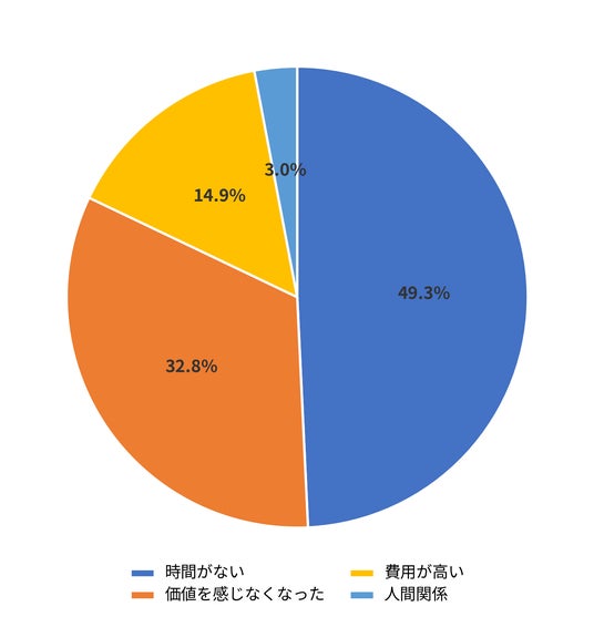 退会理由の最多は「時間がない」で、多忙な生活との両立が最大のハードルである。次に「価値を感じなくなった」が4割を超え、コンテンツの陳腐化やマンネリ化が離脱要因となる。費用面も2割あり、継続課金に見合う価値提供が運営側の課題と言える。