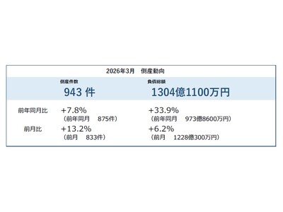 ■倒産件数は943件(前年同月875件、7.8%増)と4カ月連続で前年を上回り、2025年7月(956件)に次ぎ2025年度で3番目に多かった。単月として900件を超えるのは5カ月ぶり。3月としては、2012年(1040件)以来14年ぶりに900件超となった