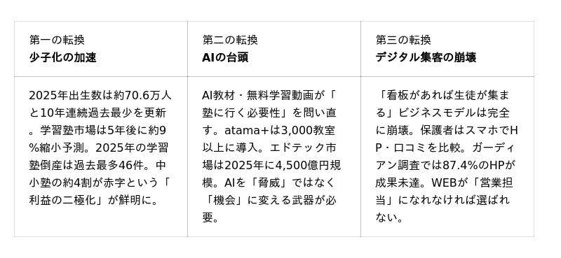 ― 少子化 × AI台頭 × 受験環境変化 × 業界特化WEB × 生き残り戦略 ―
