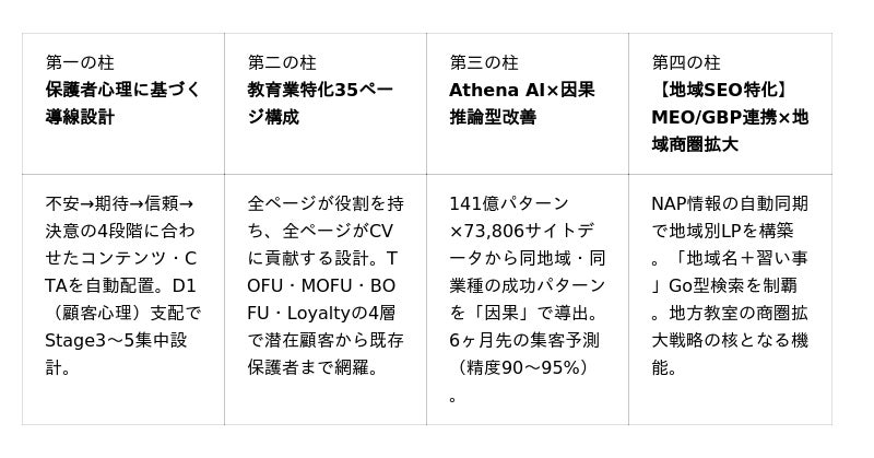 本サービスは、Athena AI(141億件の行動データを持つ因果推論エンジン)・独自の3D-CMF理論・OWLet CMS(500万パーツ・15年間脆弱性ゼロ)・77's Check!!・SCSC Legalという5つのコア技術を統合し、教育業界に特化した「育てるサイト」として設計されています。