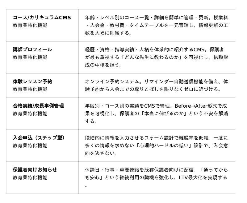 全SCSCサービス共通の第1層機能(OWLet CMS・Athena AI・SCAN DOG・SCSC Legal・SEO/MEO連携・伴走型サポート)に加え、SCSC Schoolには教育業に特化した第3層機能群が搭載されます。これらは、業界特化ヒアリング項目(共通33項目+教育業固有9項目)で収集した情報を基に自動構築されます。