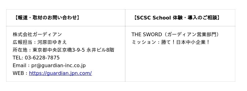 株式会社ガーディアン(代表取締役:青山裕一、所在地:東京都中央区京橋3-9-5 永井ビル8階)は、全国約120,000教室の学習塾・習い事教室・資格スクールを対象とした業界特化型WEBサービス「SCSC School(スクスク・スクール)」を2026年4月8日に正式リリースします。