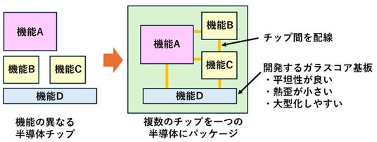 しかし、この方法ではチップの一部分に不良が発生した場合、チップ全体が使用できず歩留まりが低下することや、一部分の仕様変更を行う場合すべてを作り変える必要があり、コストがかかります。そこで、図2のように、複数のチップを一つの半導体パッケージに集積するチップレット技術が低コストと高性能化を両立する解決策として注目されています。この方法では、大きな半導体チップの中に複数の小さなチップを作製し切り分けるため、不良発生時のロスを大きく低減できます。また、仕様変更や機能拡張を行う場合も個別のチップの組合せを変えるだけで対応できます。さらに異なるメーカーのチップを組み合わせるなど柔軟な製品開発が可能になります。このチップレット技術はミクロン単位の配線が必要となるため、従来の樹脂製の基板では平坦性が悪く実現が困難でした。そこで、平坦性が高く、チップ発熱時のひずみが小さいガラス基板が注目を集めています。本プロジェクトでは、このチップレット技術に適用されるガラスコア基板の開発を進めていきます。