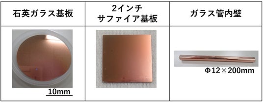 ユニバーサルめっきは銅が溶けた液体を蒸発させることで基材表面に金属の銅が付着するため、基材の種類に限らず銅膜のコーティングを行うことが出来ます。図1に実際に成膜した部材の写真を示しますが、鏡面研磨して平坦性の高い石英ガラスや半導体用のサファイア基板の表面にも成膜出来ています。これらの試料についてめっきの密着試験(JIS H 8504準拠)を実施すると、検査をクリアできるほど銅膜と基材が密着した膜が形成されています。さらに従来法では非常に困難であったガラス管内壁に均一に成膜出来ることも優位性のある特徴です。この特徴を用いると、導電性を付与した長尺のガラスの管を作製することが出来ます。