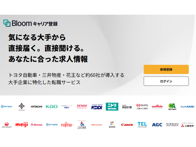 「Bloomキャリア登録」は、大手企業に特化した転職・キャリア採用プロダクトです。転職検討者は気になる大手企業を選択してキャリア情報を登録でき、経験に合った募集ポジションの案内を企業から直接受け取ることができます。2026年4月時点で68社に導入されており、トヨタ自動車、三井物産、住友商事、サントリーホールディングス、花王、KDDI、楽天グループ、NTTドコモ、野村證券、三菱地所、三井不動産など、多くの企業で活用が進んでいます。