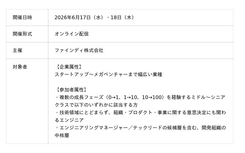 エンジニアプラットフォームを提供するファインディ株式会社(東京都品川区、代表取締役:山田 裕一朗、以下「当社」)は、2026年6月17日(水)・18日(木)に、「エンジニアの役割の変化に向き合うConference 2026」をオンラインで開催することを発表します。また、本カンファレンスのスポンサーも募集中です。