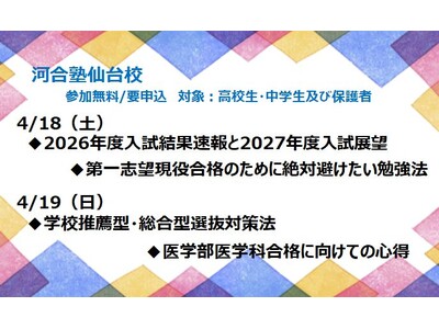 河合塾仙台校は高校生・中学生および保護者を対象に、2026年4月18日(土)と19日(日)に大学受験に関するテーマ別の学習セミナーを開催します。