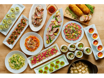 ご家族やご友人皆さまでのお集まりに最適な、バラエティ豊かなお料理をランチ・ディナーともに食べ放題でお楽しみいただけます。出来立てをご提供するライブキッチンメニューとして、ランチタイムには「ブラックお好み焼き フォアグラ添え」と「串カツ3種」を、ディナータイムには「牛ロース肉の鉄板焼」をご堪能ください。その他、「新ジャガイモのブランマンジェ クレソンのクレメ」や「鰆のカルパッチョ バジル風味」など季節の食材を使用したホテルシェフおすすめのお料理も種類豊富に取り揃えます。さらに、「オムライス」や「煮込みハンバーグ」といったキッズメニューに加え、デザートには焼き立てクレープを自由にアレンジできるコーナーやチョコレートファウンテンもあり、大人からお子様まで幅広くお楽しみいただけます。