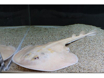 通常、ウチワザメは周囲の砂泥に紛れて身を隠すため、体色は茶褐色をしています。しかし、今回展示する個体は、全身が真っ白で、自然界では非常に目立つ存在です。白い体は天敵に狙われやすく、生存に不利とされていますが、ウチワザメには砂の中に隠れる習性があるため、その体をうまく隠すことで生き延びてきたのかもしれません。