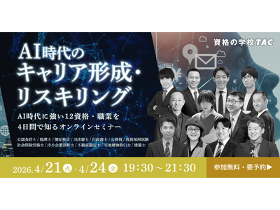 資格取得に向けた教育サービスを展開するTAC株式会社は、社会人のリスキリングや大学生の就職活動・キャリア形成を支援するため、2026年4月21日(火)~4月24日(金)の4日間、無料オンラインイベント「AI時代のキャリア形成・リスキリング」を開催いたします。