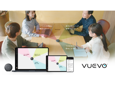 「VUEVO」は、独自開発のワイヤレスマイクと専用アプリケーションを用いて、聴覚障害や聞こえにくさがある人と聴者のコミュニケーションをスムーズにします。360°全方向から音声を集音して発話者の方向を特定し、複数名の同時発話も「誰が」「何を」話しているかリアルタイムに表示されます。また、20か国語以上に対応したリアルタイム翻訳機能や、ChatGPTを活用した要約を自動生成、議事録にも活用できます。