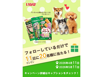 いなばペットフード株式会社(いなば食品グループ 本社:静岡県静岡市清水区由比 会長:稲葉優子)は、2026年4月11日(土)23:59まで、弊社Instagram公式アカウントにて「ワンワンキャンペーン」を開催中です。