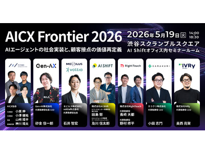 一般社団法人AICX協会(東京都、代表理事:小栗 伸/小澤 健祐、以下、AICX協会)は、CX領域のAI企業6社とともに、ビジネスカンファレンス「AICX Frontier 2026 ~AIエージェントの社会実装と、顧客接点の価値再定義~」を2026年5月19日(火)に東京・渋谷スクランブルスクエアにて開催します。