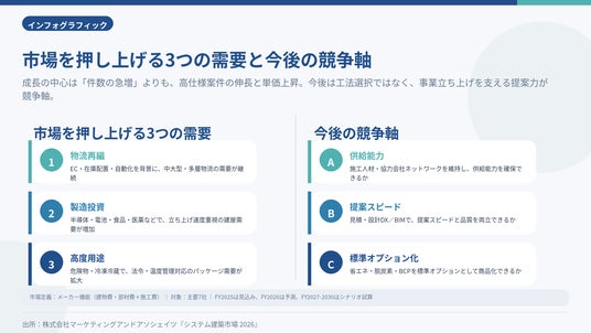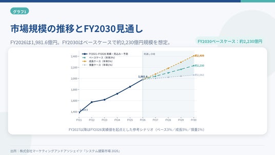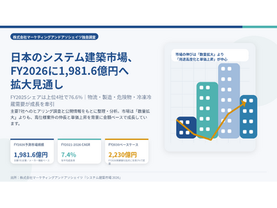 株式会社マーケティングアンドアソシェイツ(東京都千代田区)は、関係各所へのヒアリングと公開情報をもとに、日本のシステム建築市場に関する独自調査を実施し、その結果をまとめた『システム建築市場 2026~日本のシステム建築市場の現状分析と見通し(2021年度-2026年度)~』を2026年4月13日に発行致します。あわせてこのたび、報道関係者向けに主要ポイントを整理したメディア向けサマリーを公開しました。サマリーは本リリースページ内でご覧いただけるほか、PDF資料としてダウンロードいただけます。