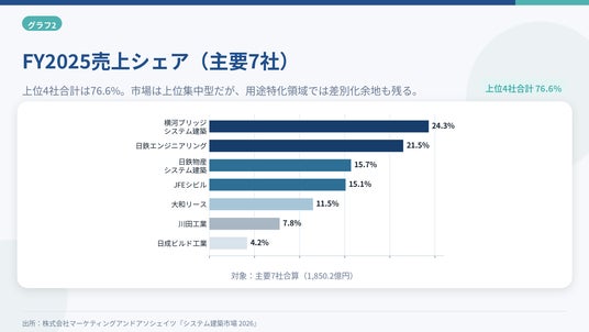 FY2025の市場構造を見ると、横河ブリッジシステム建築が24.3%で首位、日鉄エンジニアリング21.5%、日鉄物産システム建築15.7%、JFEシビル15.1%が続き、上位4社で76.6%を占めています。市場は依然として上位集中型ですが、一方で危険物、冷凍冷蔵、多層物流といった用途特化領域では、提案力や供給体制、法令対応力の差が競争力に直結する余地が残されていることも今回の調査で明らかになりました。数量の積み上げだけでなく、案件単価と仕様レベルの上昇が市場規模を押し上げている点は、現在の市場を理解するうえで重要なポイントです。