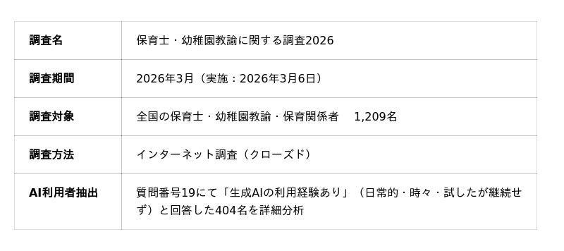 保育AI(TM)を中心としたテクノロジーの力で保育や子育てに関する社会課題を解決するユニファ株式会社(本社:東京都千代田区、代表取締役CEO:土岐泰之、以下「ユニファ」)は、全国の保育士・幼稚園教諭など1,209名を対象にした「保育士・幼稚園教諭のAI活用に関する実態調査 2026」(以下、「今回調査」)を2026年3月実施しました。