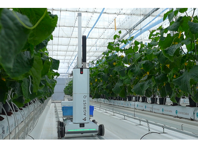 AGRISTのAI搭載自動収穫ロボット「Q」は畝間に敷かれたレール上を移動します。独自開発の収穫ハンドには、誤収穫防止センサーとカメラが搭載されており、AIが収穫適期の作物を自動で判別・収穫します。また、施設園芸ハウスのキュウリに特化して開発を進めたことにより、収穫ハンド部分の交換だけで他の作物にも対応可能な、汎用性の高い設計の実現を目指しています。