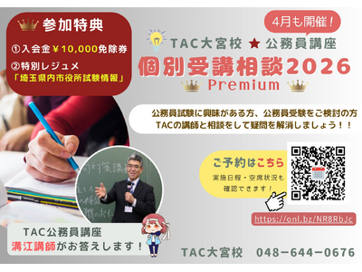 公務員試験対策講座を展開しているTAC株式会社(東京都千代田区)は、TAC大宮校にて「公務員講座 個別受講相談2026 Premium」を4月も開催中です。