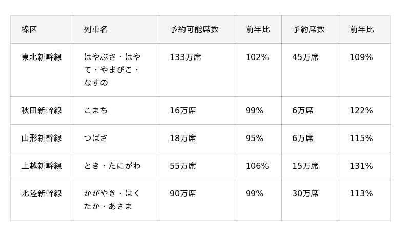 4月24日(金)から5月6日(水)までの13日間における指定席予約席数は、4月9日(木)現在(※1)、新幹線102万席、在来線を含めた全体では128万席となっております。