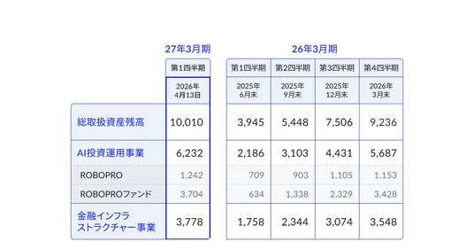 当社グループは、「ROBOPRO(R)」、「4RAP」を活用した投資一任運用サービスおよびAI予測を活用した投資助言など、多様な金融ソリューションの提供を通じて、様々なお客さまのニーズに対応してきました。この度、総取扱資産残高が1兆円を突破したことは、これまでの取り組みが着実に広がりを見せている結果と受け止めています。当社グループの総取扱資産残高については、2025年3月末時点の約2,632億円から、1年間で約6,604億円増加し、約3.5倍の規模となりました。