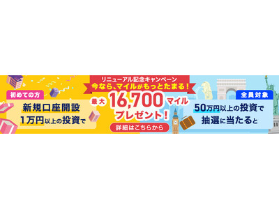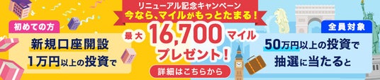 2.新規および既存:2026年3月16日(月)~2026年6月12日(金)までに投資実行50万円以上をした方 → 抽選で10名様に 15,000マイル積算