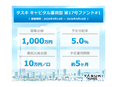 株式会社タスキホールディングス(本社:東京都港区、代表取締役社長:柏村 雄)のグループ会社である株式会社タスキ(本社:東京都港区、代表取締役社長:村田浩司、以下、タスキ)は、不動産投資型クラウドファンディングサービス「TASUKI FUNDS」において、2026年4月14日より「タスキ キャピタル重視型 第17号ファンド#1」の投資募集をいたしますので、お知らせします。