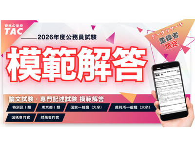 公務員、日商簿記検定、税理士、公認会計士などの資格取得に向けた教育サービスを展開しているTAC株式会社(東京都千代田区)は、4/19(日)実施の「東京都I類B[行政/一般方式]採用試験」と「特別区I類[一般事務]採用試験」の専門記述試験・論文試験の模範解答を本試験データリサーチ登録者限定で、4/24(金)17時よりホームページで公開いたします。