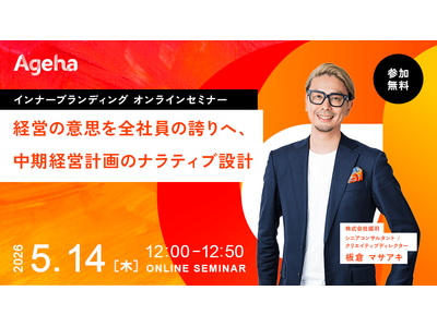 コーポレートブランディング支援を行う株式会社揚羽(東京都中央区 代表取締役社長:湊 剛宏 証券コード:9330)は、2026年5月14日(木)に「経営の意志を全社員の誇りへ、中期経営計画のナラティブ設計」と題したオンラインセミナーを開催します。