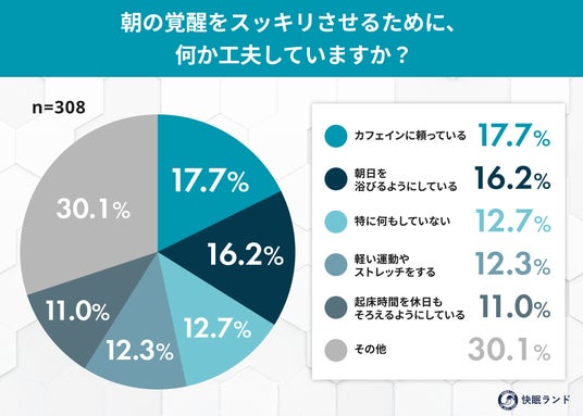 - その他:30.1%(目覚まし時計を使っている:9.7%、起きてすぐ冷たい水を飲む:8.8%、工夫したいが何をすればいいかわからない:5.8% など)