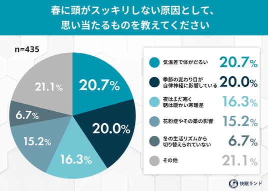 春は、日の出時間が早まる一方で、寒暖差や新生活のストレスなど、自律神経を乱す要因が重なる季節です。本来、日照時間の変化に合わせて体内時計もシフトする必要がありますが、現代のライフスタイルではその調整が追いつかず、「起きているのに脳が働かない」状態を招きがちです。今回の調査では、多くの人が感じている「春のぼんやり感」の正体を探るとともに、自覚している原因と、実際に行っている対策の“ギャップ”を明らかにしました。