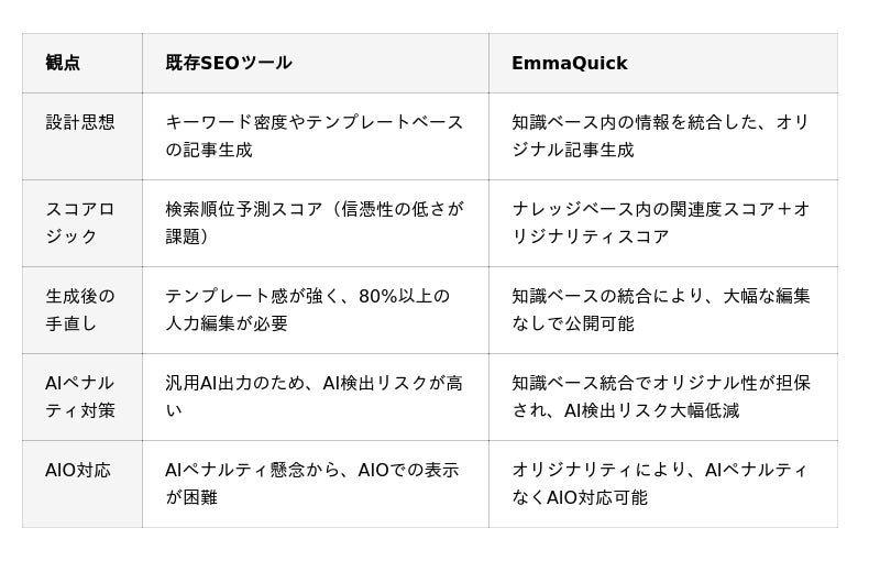 ナレッジベースAIライティング技術により、EmmaQuickは従来のSEOツールでは実現できない機能を提供します。