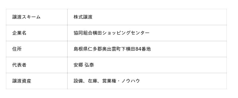 本件は、島根県奥出雲町に位置する地域密着型ショッピングセンター「横田蔵市」の株式譲渡案件です。複数の事業者が参画する協同組合方式で運営されており、1995年の移転オープン以来、地域の「台所」として不可欠な存在となっています。