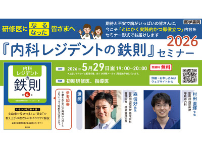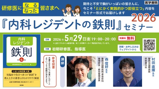 株式会社医学書院 (所在地:東京都文京区、代表取締役社長:金原 俊)は、この春に研修医になった医師および指導医に向けた無料Webセミナー「『内科レジデントの鉄則』セミナー2026」を5月29日に開催します。