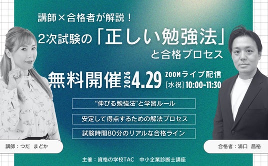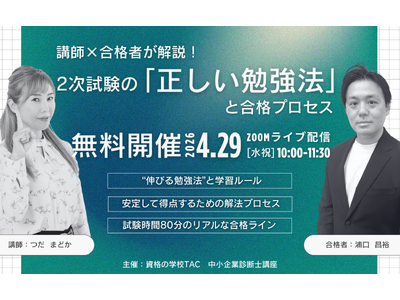 中小企業診断士、社会保険労務士、公認会計士などの資格取得に向けた教育サービスを展開しているTAC株式会社(東京都千代田区、代表取締役:多田 敏男)は、2026年4月29日(水・祝) 10:00より、中小企業診断士2次試験の合格を目指す方に向けて、再現可能な解答プロセスと学習法を学べる無料セミナーを開催します。