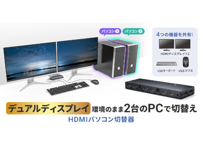 サンワサプライ株式会社(本社:岡山市北区田町1-10-1、代表取締役社長 山田和範)は、HDMIディスプレイ2台(4K)・USBキーボード・USBマウスを2台のパソコンで切り替えて使用できるデュアルディスプレイ対応パソコン切替器「SW-KVM22HUUS」を発売します。